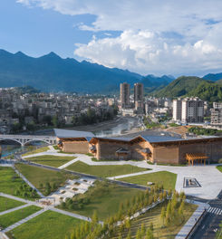 The visitor center adopts a modern wooden structure as a whole, integrating traditional Tujia architectural symbols such as "Tujia Stilt House" and "Sword-back Beam", which embodies the integration of tradition and contemporary. The building body of the Sky-Touch Tower adopts a reinforced concrete structure, and the exterior of the building, looking like eaves of the wings, is made of Glued Laminated Wood, which not only demonstrates the contemporary spirit, but also reflects the tribute to the Tujia wooden structure tradition. The Literati Bridge is located on the Longtan River with a total length of 78 meters. The bridge structure is reinforced concrete arch voucher, and the upper structure is made of Glued Laminated Wood. The roof is set with 5 levels of heights and is decorated with small cyan tiles to create a moderate tension with the surrounding environment.